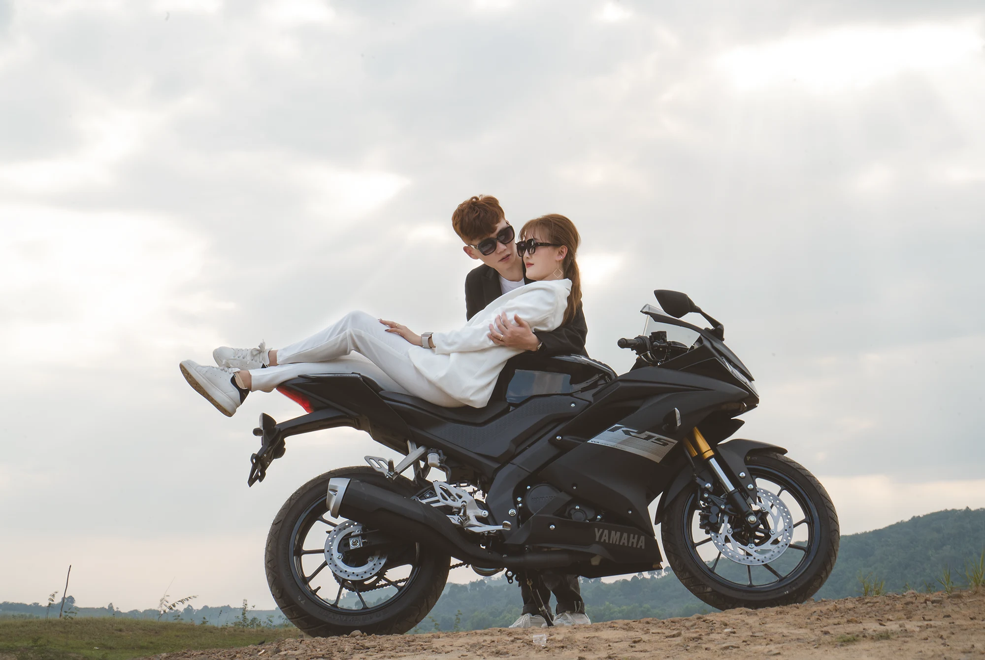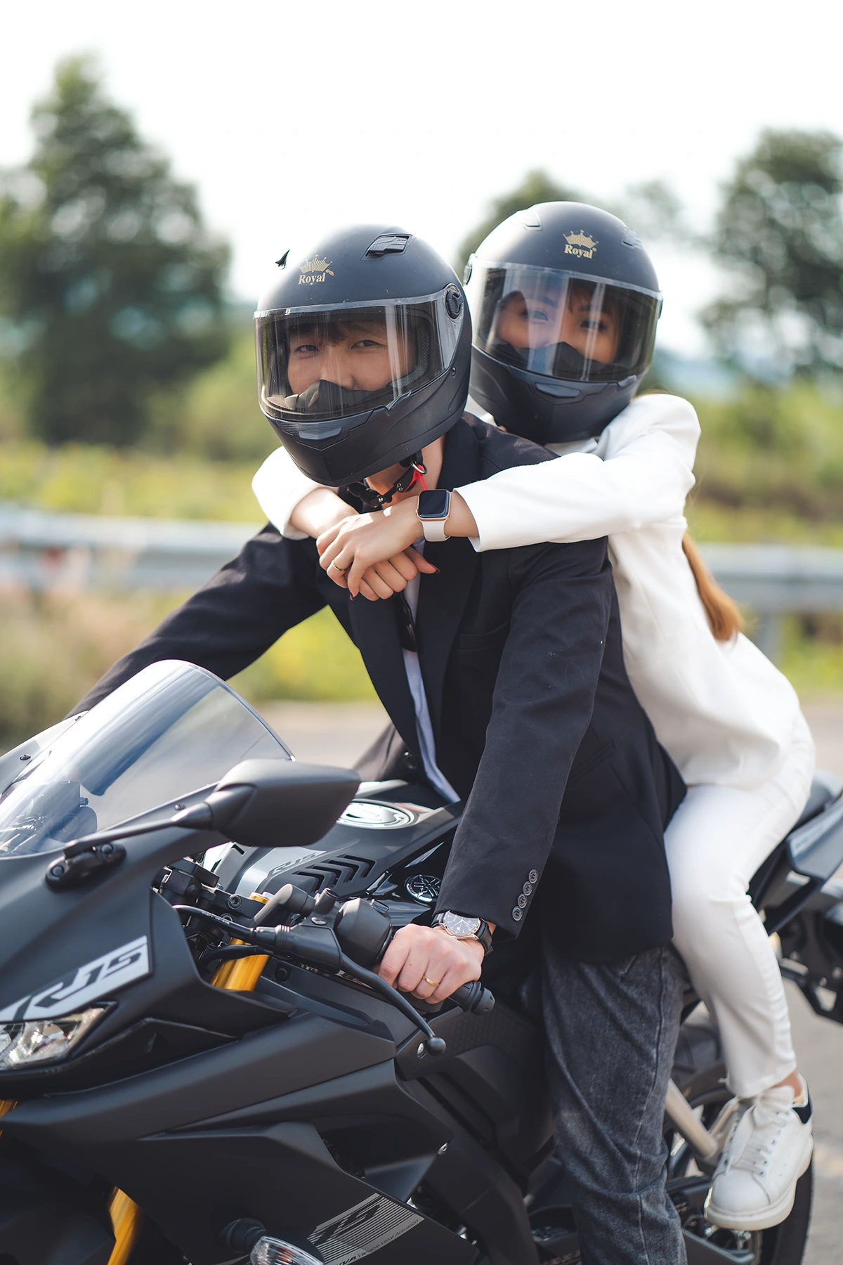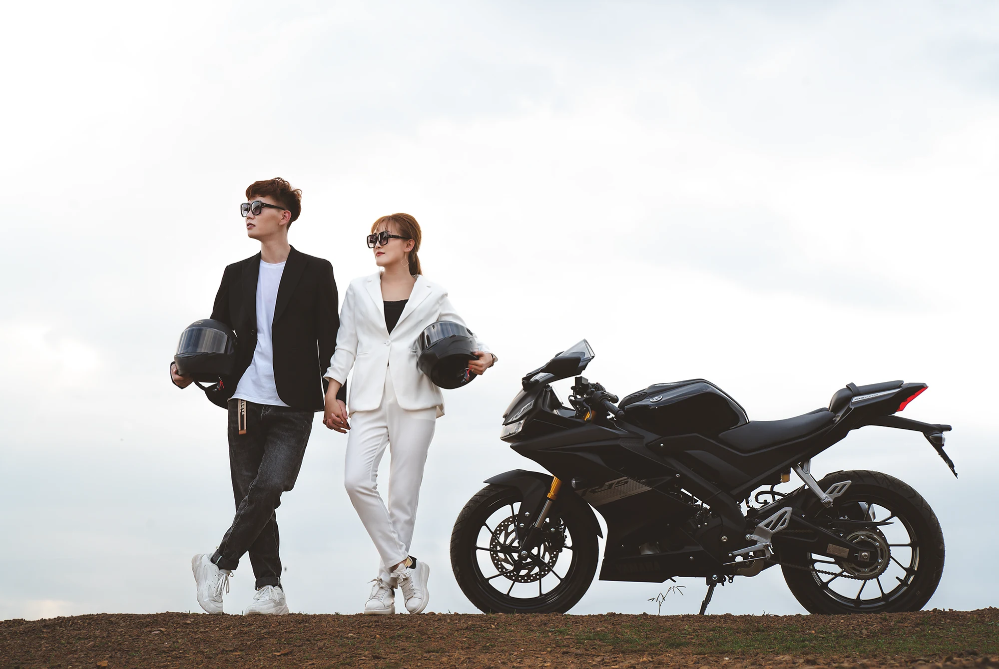 Một chiếc moto màu đen lôi cuốn, là nguồn cảm hứng chính cho bộ ảnh cưới chụp cùng moto này. Cặp đôi, mặc trang phục màu đen và trắng, không chỉ tạo nên sự đồng điệu với chiếc moto màu đen mà còn tôn lên vẻ sang trọng lạ mắt.