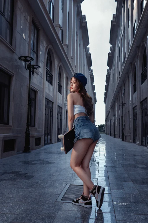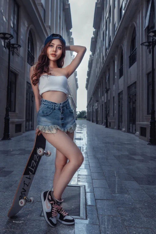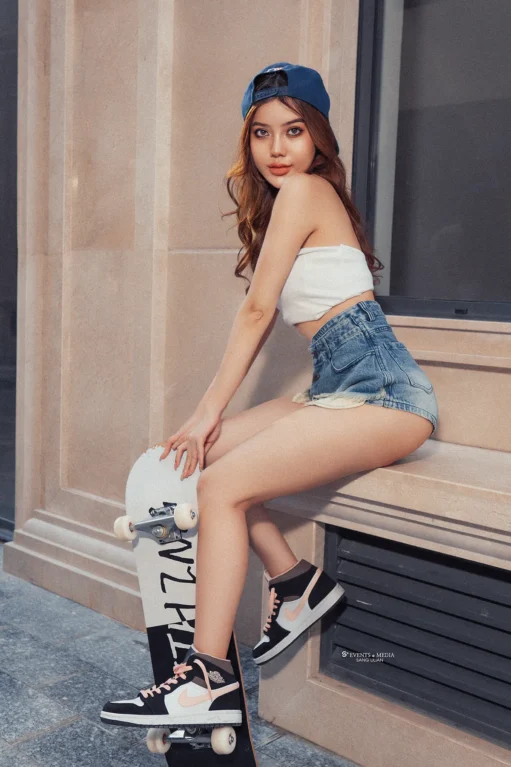 Thời trang của cô gái trượt ván không chỉ giới hạn trong các bộ quần áo thể thao, mà còn là sự kết hợp tinh tế giữa phong cách cá nhân và sự thoải mái. Áo thun, quần short jean thoải mái là những lựa chọn phổ biến.