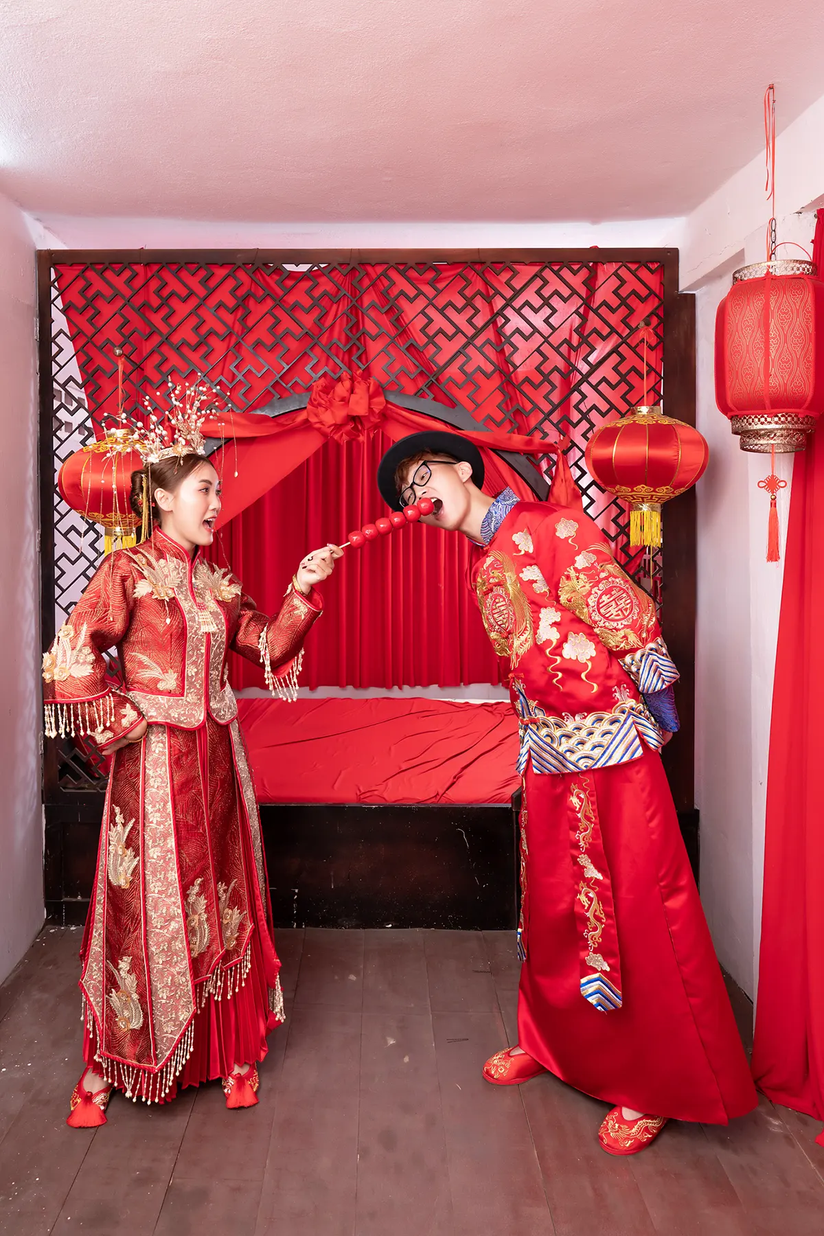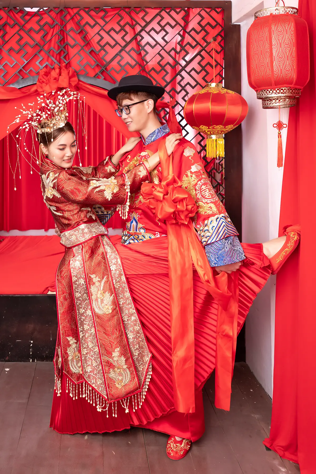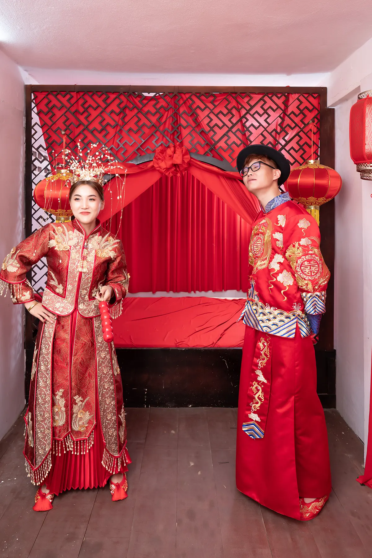 Each pose is crafted to bring out their personalities, from shy glances to bursts of laughter, capturing the essence of their relationship. Set against a background resembling an old-fashioned Chinese bridal chamber, complete with classic furnishings and a warm, nostalgic atmosphere, the photos blend romance and humor seamlessly. The result is an album that’s not only beautiful and memorable but also uniquely theirs—full of life, laughter, and love, just like the journey they’re about to begin together.