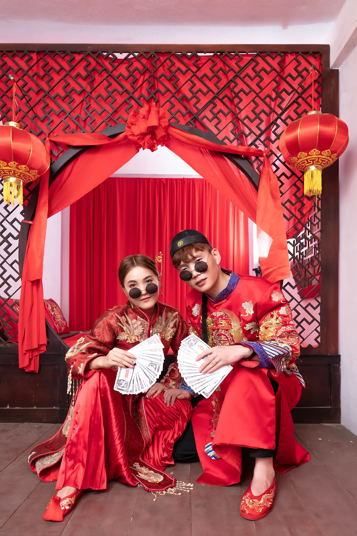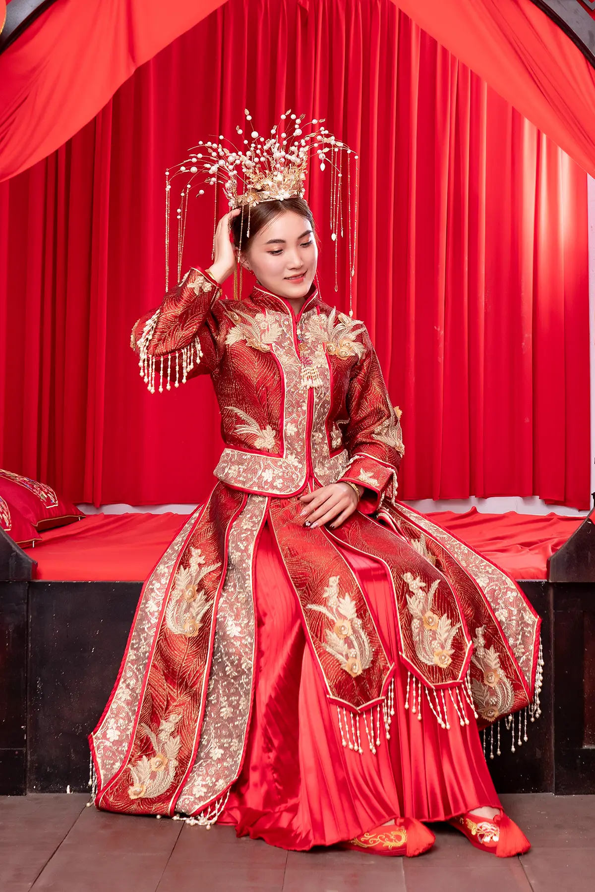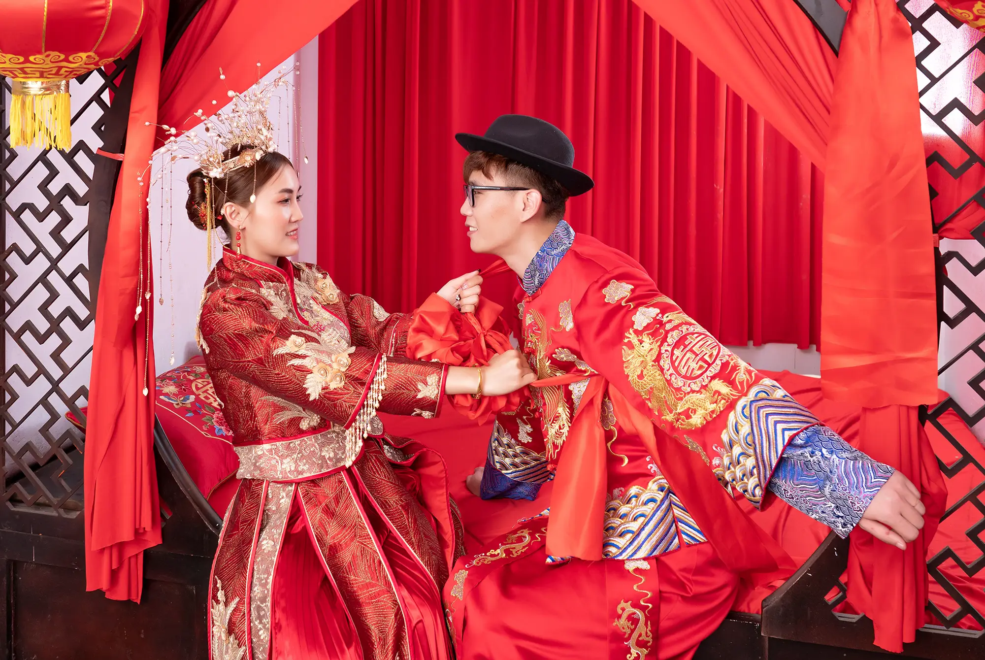 The pre-wedding photo album in the Chinese bridal chamber, inspired by the theme of a traditional Chinese bridal chamber, captures the charm of a “first-night” ritual with a delightful twist. This playful shoot brings ancient customs to life in a way that feels fresh and endearing. The couple wears vibrant, elaborate red and gold wedding attire, each garment rich with embroidery that tells a story of love and luck.