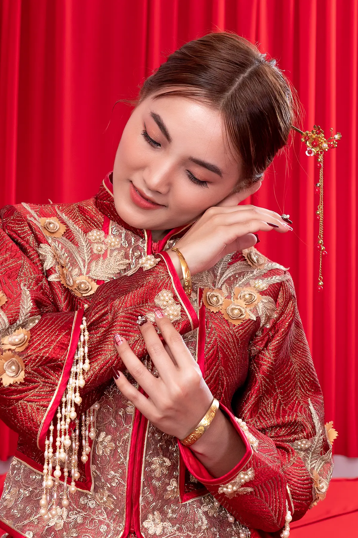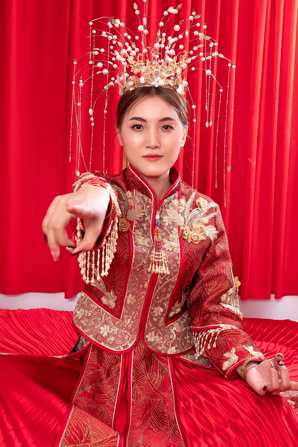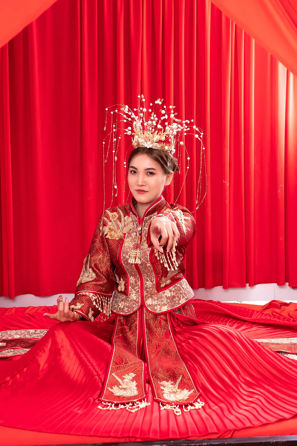 The pre-wedding photo album in the Chinese bridal chamber, inspired by the theme of a traditional Chinese bridal chamber, captures the charm of a “first-night” ritual with a delightful twist. This playful shoot brings ancient customs to life in a way that feels fresh and endearing. The couple wears vibrant, elaborate red and gold wedding attire, each garment rich with embroidery that tells a story of love and luck.